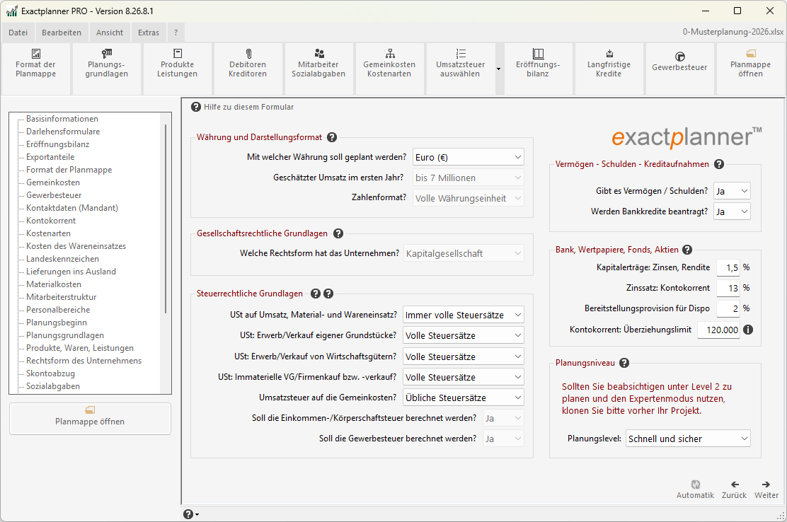 Vor Beginn der eigentlichen Umsatz- und Kostenplanung werden die grundlegenden Inhalte der Planmappe definiert. Dies umfasst die Festlegung von Positionsbezeichnungen innerhalb der verschiedenen Teilpläne sowie die Berücksichtigung steuerlicher und sozialrechtlicher Eigenschaften, die im Gesamtplan von Bedeutung sind. Die Festlegungen erfolgen in der Regel per Mausklick in einem einfachen Frage-Antwort-Verfahren.